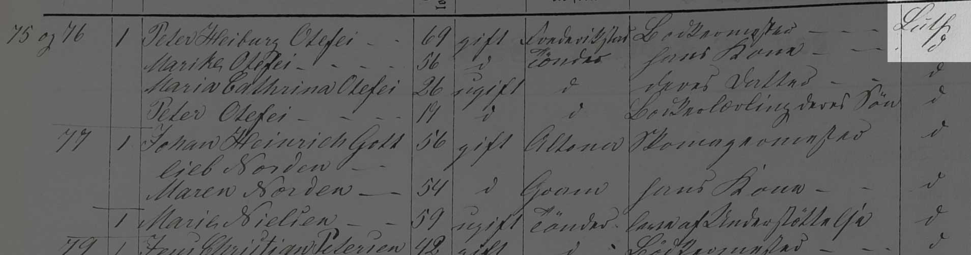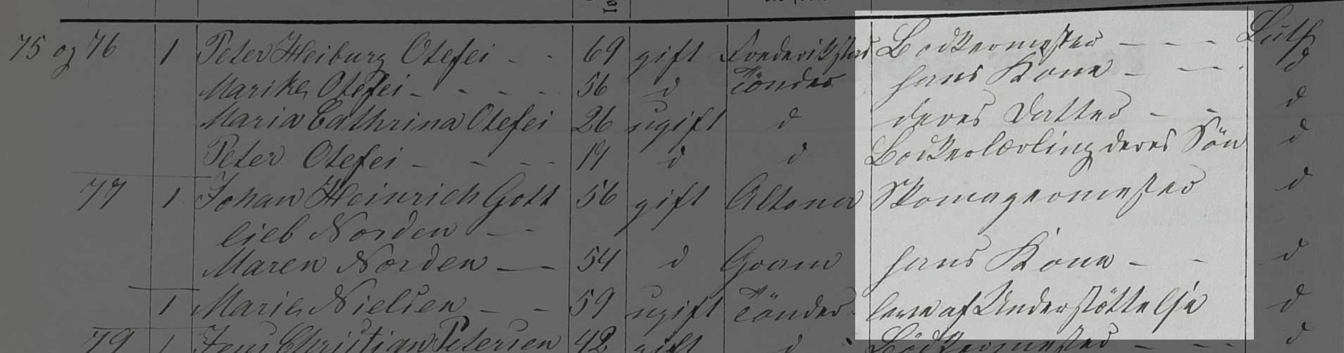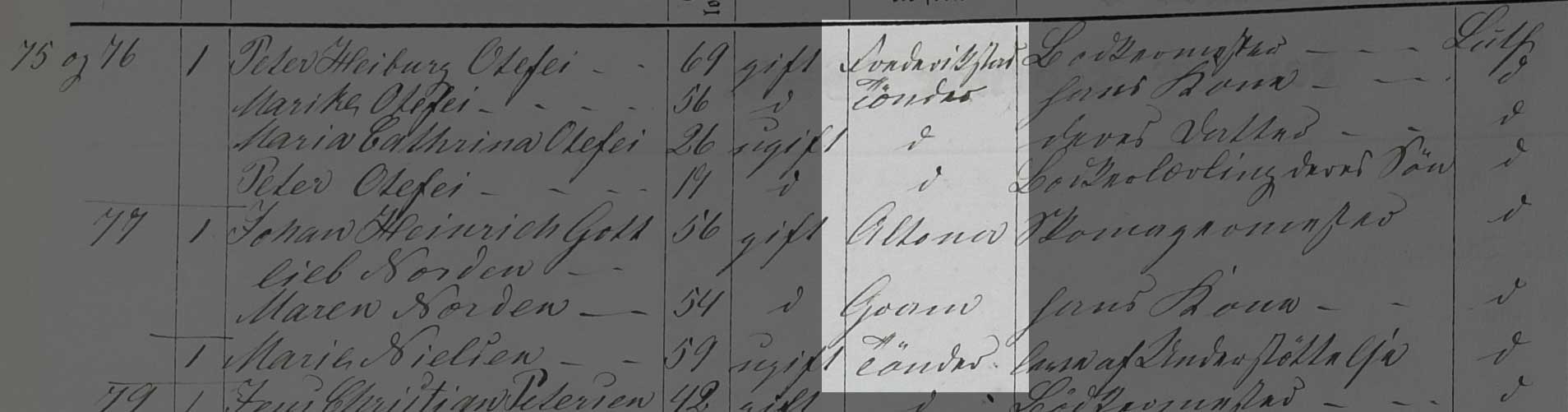Kilden er Folketælling Tønder Købstad, 1860, Syd vest kvarter, hus 75, 76 og 77 (Landsarkivet for Sønderjylland, Originale folketællinger, 120F).