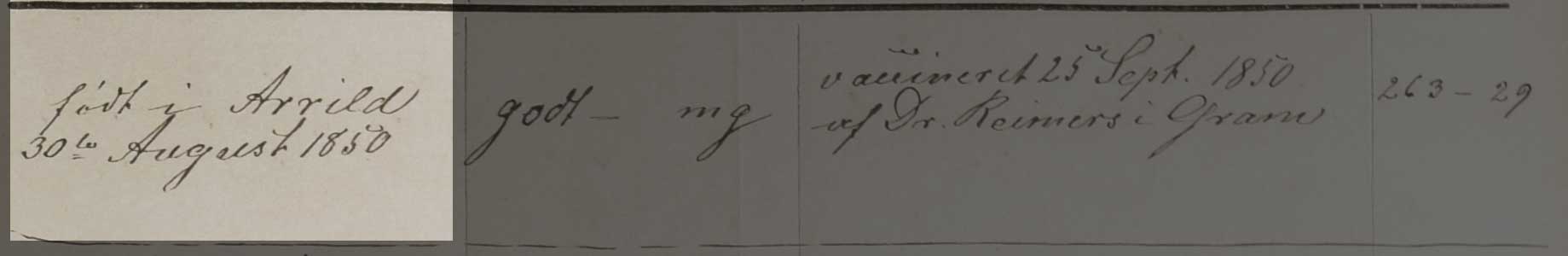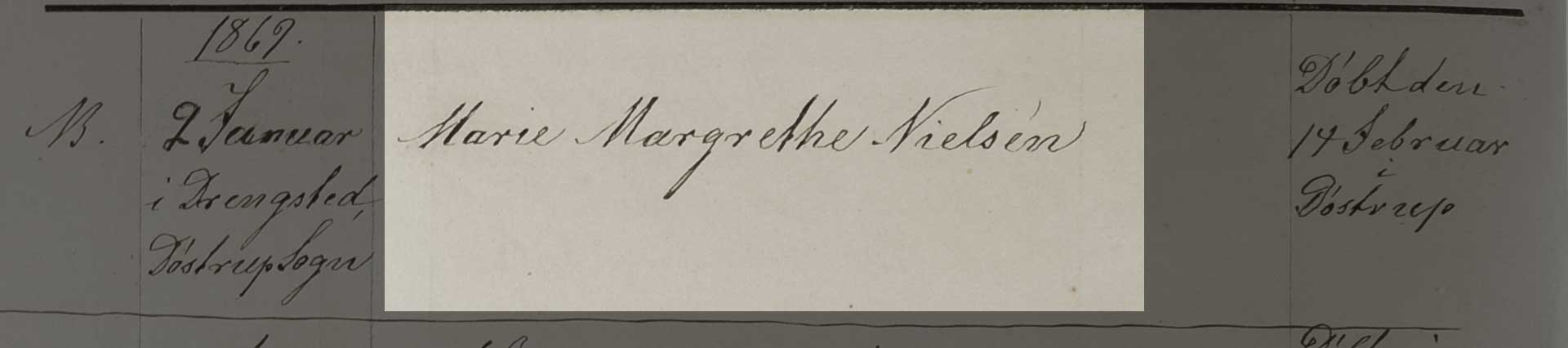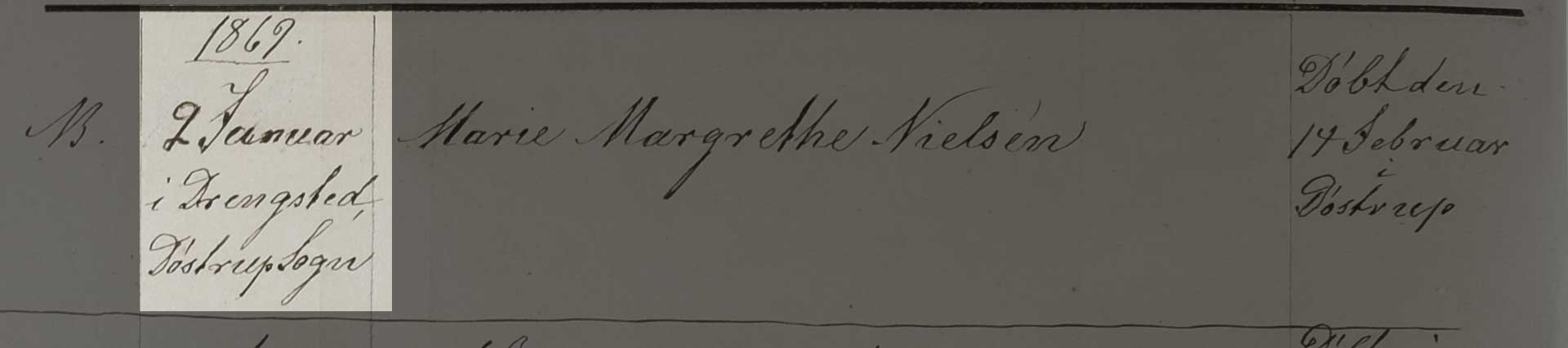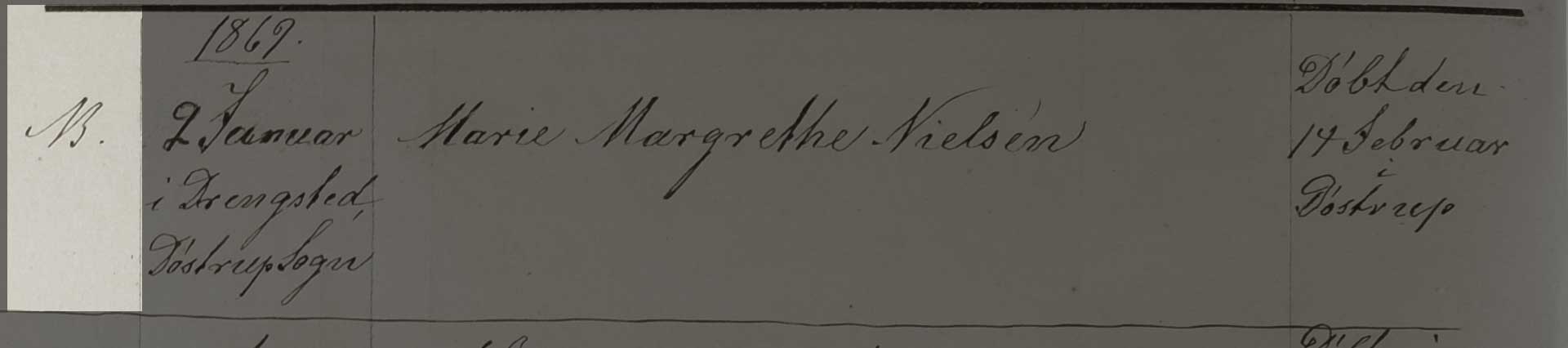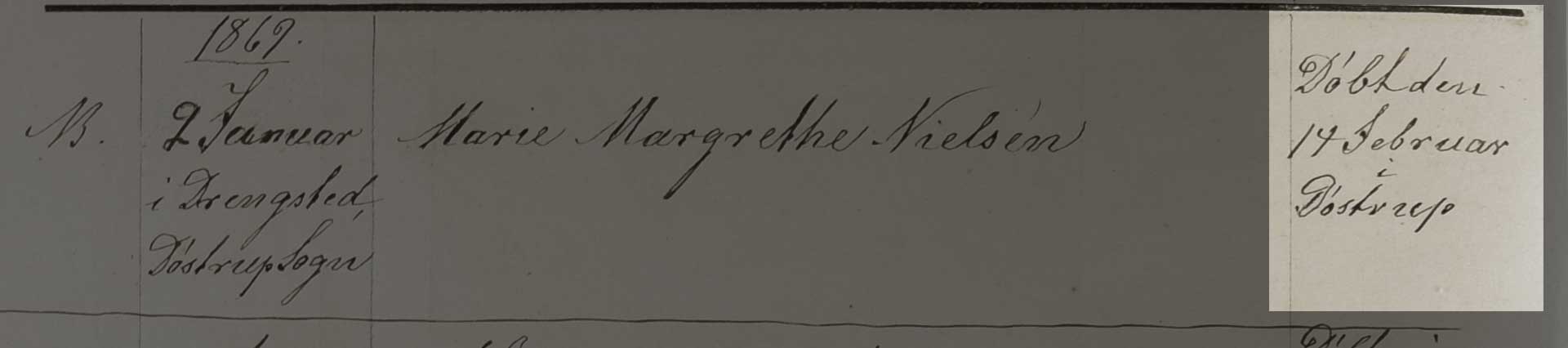 Kilden er Arrild kirkebog, Ab1, fødte kvinder, side 73, indføring NB, fra 1869.